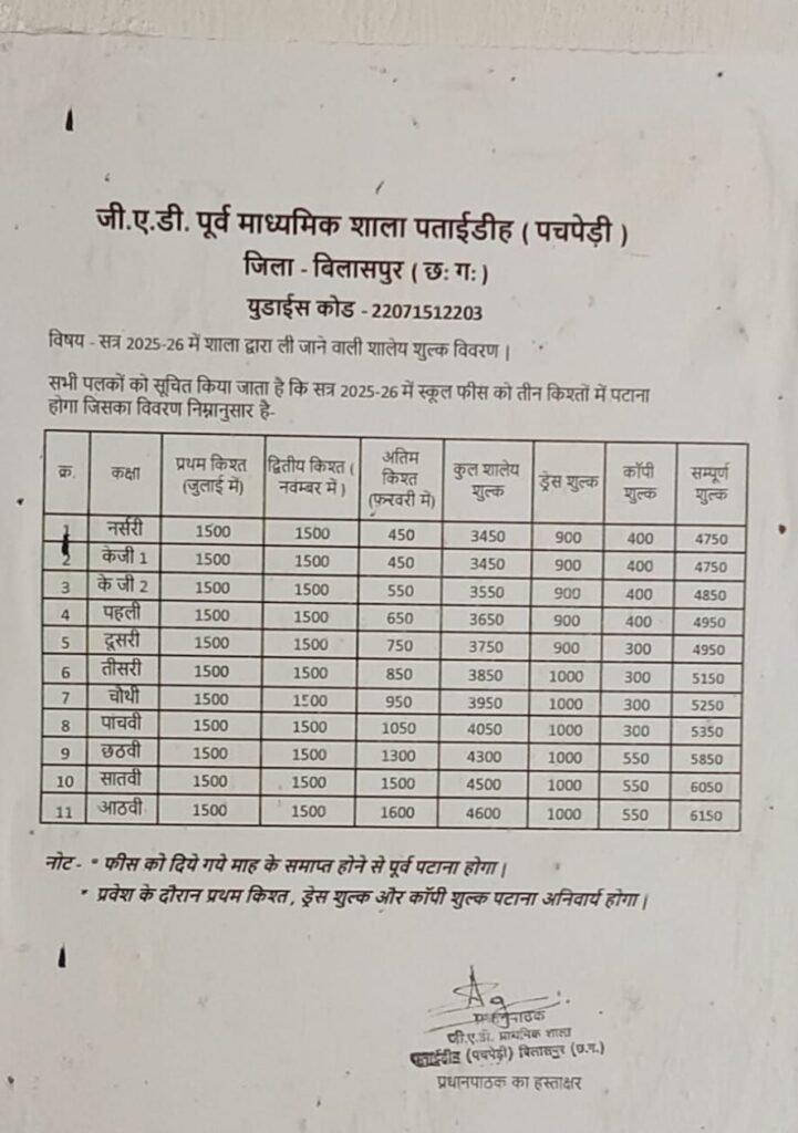 मस्तूरी। मस्तुरी जनपद क्षेत्र के ग्राम पंचायत पताईडीह में जैतपुरी जाने की ओर वाली सड़क से कुछ दूरी पर सरकारी जमीन पर अवैध कब्जा कर निजी स्कूल जी,ए,डी, के नाम से चलाया जा रहा है और छत्तीसगढ़ सरकार व राजस्व विभाग को लाखों रुपयो का घाटे में पहुंचाया जा रहा है जबकि सरकार की सरकारी जमीन है उसको जी,एम,डी स्कूल के संचालक द्वारा प्रति छात्र छात्राओं से सालाना 6 हजार से अधिक रुपए ले रहे हैं सरकारी जमीन पर कब्जा कर स्कूल संचालित कर लाखों रुपयो का कमाई किया जा रहा है ।
