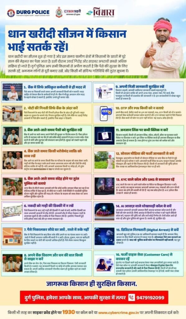 धान खरीदी सीजन में किसानों की आर्थिक सुरक्षा सर्वोपरि — दुर्ग पुलिस ने जारी किया जागरूकता पोस्टर, किसान भाइयों से सतर्क रहने की अपील