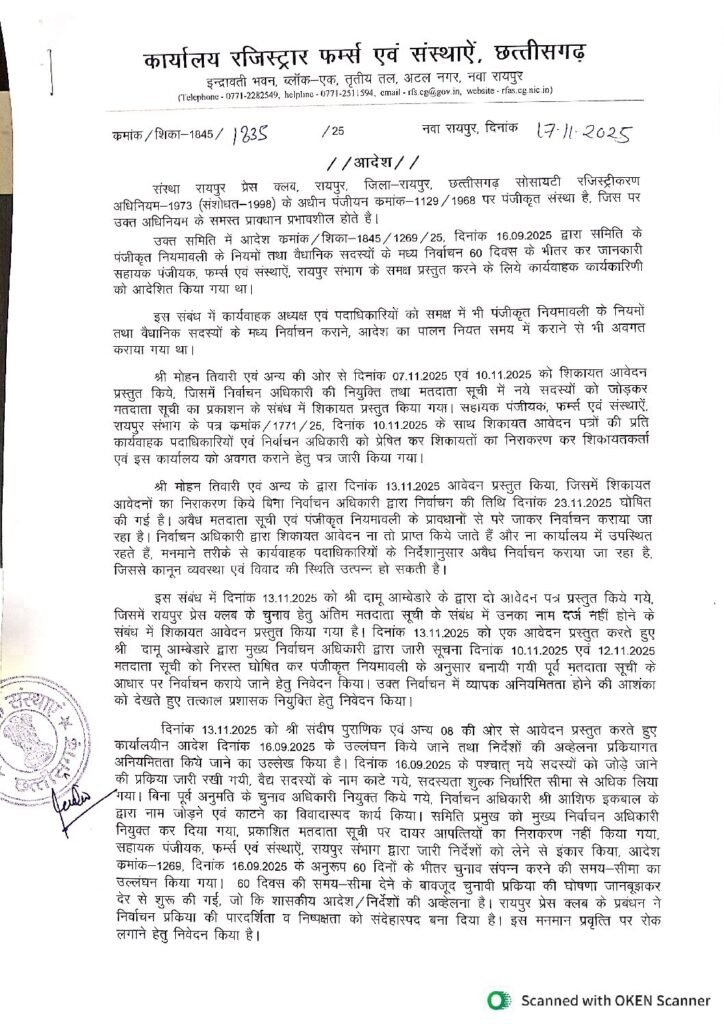 रायपुर प्रेस क्लब चुनाव स्थगित, अब घोषित होगी नई तिथि, देखें आदेश…