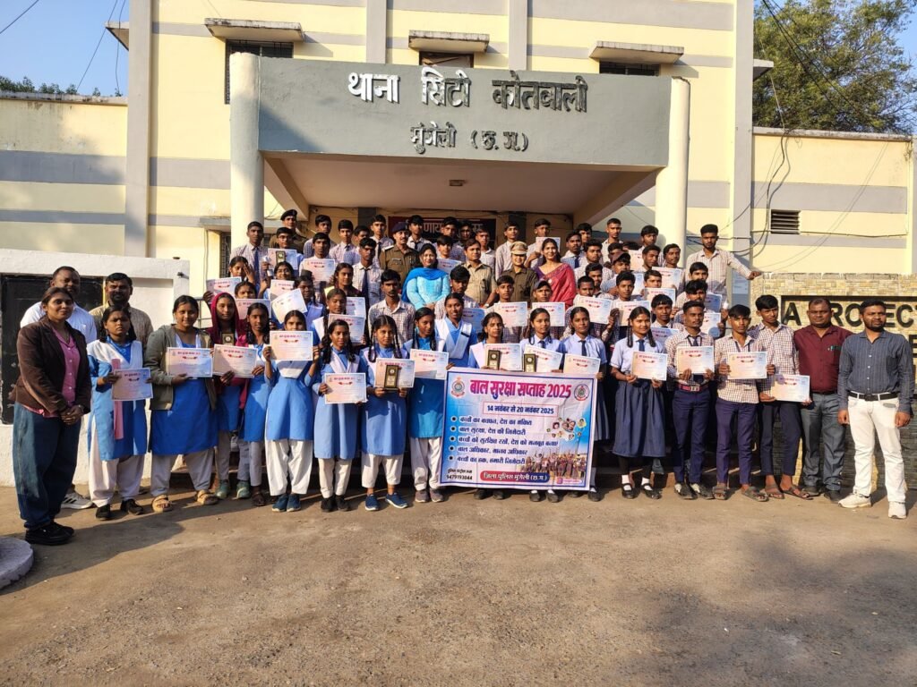 मुंगेली । जिले में 14 नवंबर 2025 से प्रारंभ हुआ ‘बाल सुरक्षा सप्ताह 2025’ आज दिनांक 20 नवंबर 2025 को सिटी कोतवाली मुंगेली परिसर में आयोजित भव्य कार्यक्रम के साथ संपन्न हुआ। पुलिस अधीक्षक भोज राम पटेल के निर्देशन में आयोजित इस सप्ताहभर चलने वाले अभियान का उद्देश्य बच्चों को सुरक्षा, जागरूकता, आत्मरक्षा, साइबर सतर्कता और सामाजिक जिम्मेदारी के प्रति शिक्षित करना था।