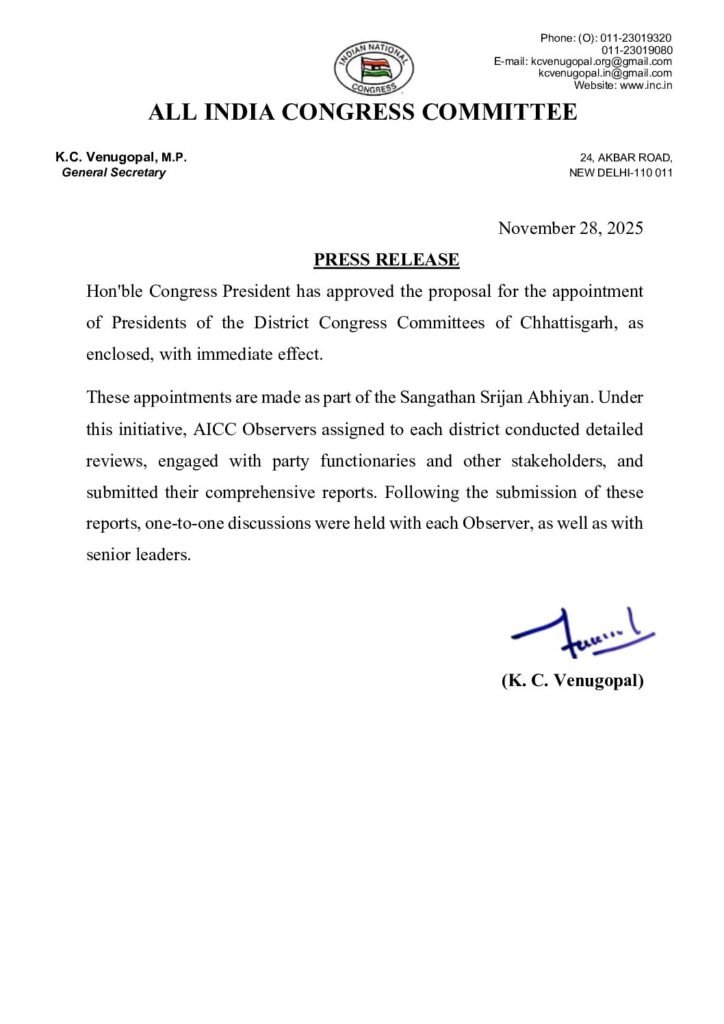 जानकारी के अनुसार, ये सभी नियुक्तियाँ कांग्रेस के संगठन सृजन अभियान का हिस्सा हैं। इस अभियान के तहत अखिल भारतीय कांग्रेस कमेटी (AICC) ने प्रदेश के प्रत्येक जिले में पर्यवेक्षक भेजे थे, जिन्होंने स्थानीय स्तर पर पार्टी पदाधिकारियों, कार्यकर्ताओं और विभिन्न सामाजिक समूहों के साथ विस्तृत चर्चा की।