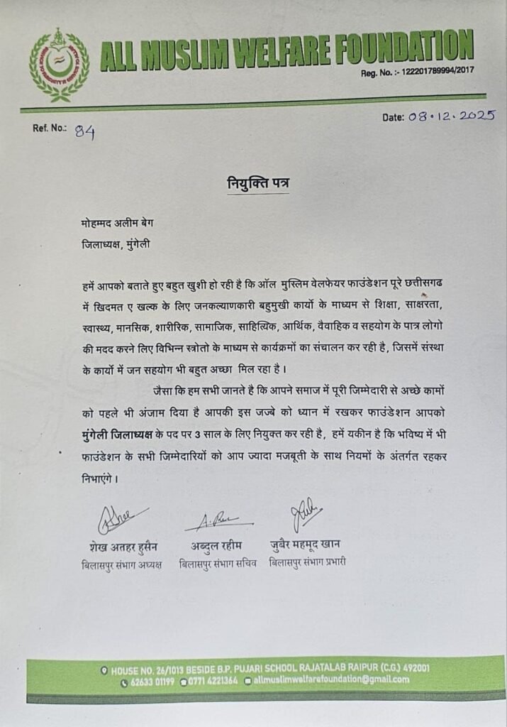 मुंगेली । ऑल मुस्लिम वेलफेयर फाउंडेशन, जो पूरे छत्तीसगढ़ में शिक्षा, स्वास्थ्य, साक्षरता, सामाजिक सहायता और जनकल्याणकारी कार्यक्रमों के लिए कार्यरत है, जिसने संगठन का विस्तार करते हुए मुंगेली जिले के लिए नई जिम्मेदारी का ऐलान किया है। संस्था ने मोहम्मद अलीम को 3 वर्ष के कार्यकाल के लिए मुंगेली जिलाध्यक्ष नियुक्त किया है।संस्था द्वारा जारी नियुक्ति पत्र में बताया गया है कि फाउंडेशन जरूरतमंद लोगों तक विभिन्न माध्यमों से सहायता पहुंचा रहा है। संस्था को भरोसा है कि नई जिम्मेदारी मिलने के बाद मोहम्मद अलीम संगठन के उद्देश्यों को और मजबूत करेंगे।