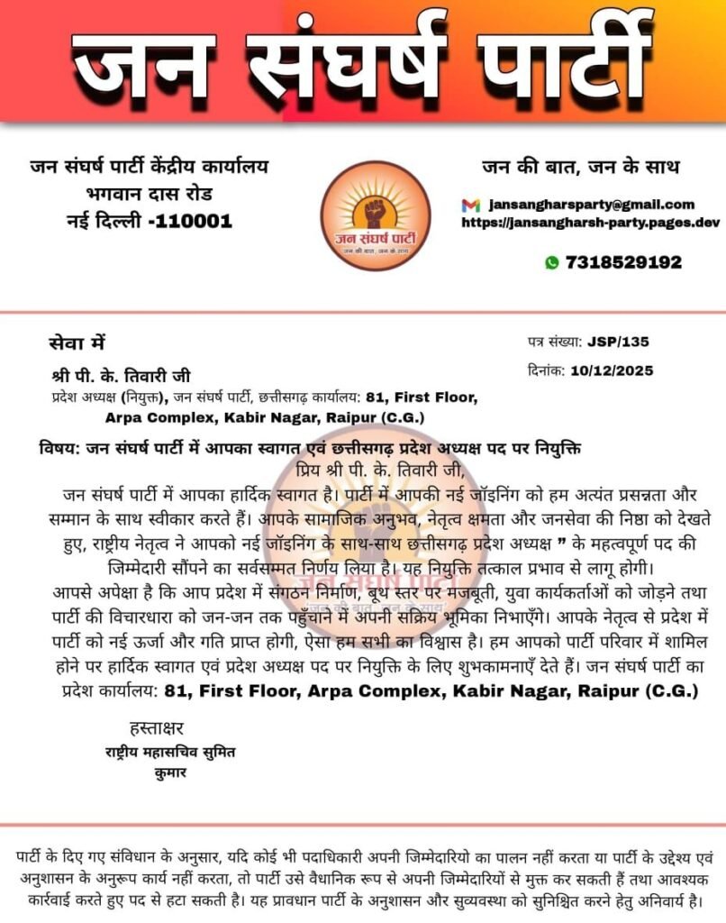 छत्तीसगढ़ में जन संघर्ष पार्टी ने किया डॉ पंडित पीके तिवारी को प्रदेश अध्यक्ष नियुक्त