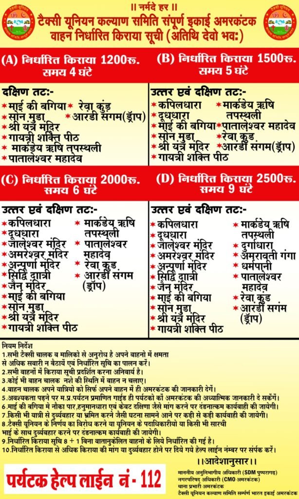 टैक्सी यूनियन द्वारा जारी निर्देशानुसार , अमरकंटक क्षेत्र में संचालित सभी टैक्सी एवं यात्री वाहनों के चालकों को अपने-अपने वाहनों में किराया सूची स्पष्ट रूप से प्रदर्शित करना अनिवार्य किया गया है ताकि पर्यटकों एवं स्थानीय यात्रियों को यात्रा से पूर्व किराए की सही जानकारी प्राप्त हो सके ।