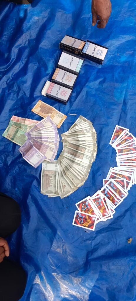 रेड कार्रवाई के दौरान आरोपी रुपये-पैसे का दांव लगाकर 52 पत्ती ताश से जुआ खेलते और खिलाते हुए पाए गए। पूछताछ में आरोपियों ने संगठित रूप से जुआ संचालन करना स्वीकार किया। पुलिस ने सभी आरोपियों को मौके से गिरफ्तार कर लिया।