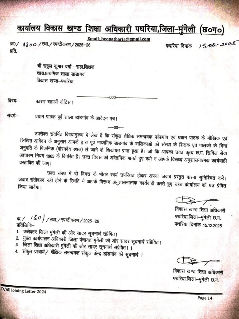 मुंगेली | विकास खण्ड शिक्षा अधिकारी पथरिया ने शासकीय प्राथमिक शाला डांडगांव के एक सहायक शिक्षक को गंभीर लापरवाही के आरोप में कारण बताओ नोटिस जारी किया है। मामला बिना विभागीय अनुमति के विद्यालय की बालिकाओं को पिकनिक पर ले जाने से जुड़ा हुआ है।