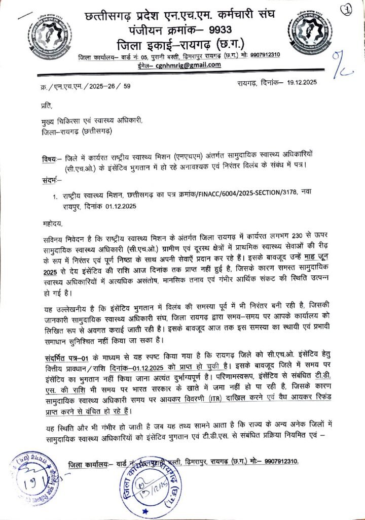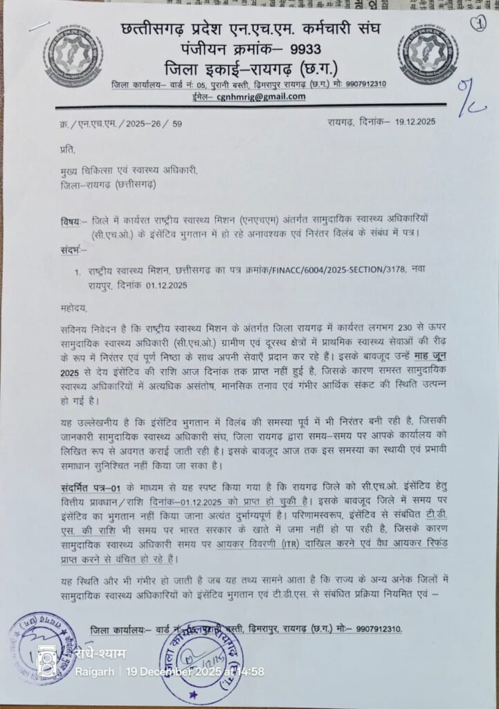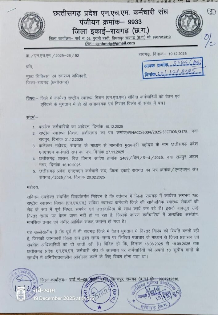 रायगढ़ । एनएचएम के तहत कार्यरत संविदा स्वास्थ्य कर्मचारियों एवं सामुदायिक स्वास्थ्य अधिकारियों (सीएचओ) को वेतन, 5 प्रतिशत एरियर्स एवं इंसेंटिव भुगतान में हो रही अनावश्यक देरी पर गंभीर चिंता व्यक्त की जाती है। यह समस्या विशेष रूप से रायगढ़ जिले में उभरकर सामने आ रही है, जहां कर्मचारी पूर्ण निष्ठा के साथ जन स्वास्थ्य सेवाओं में योगदान दे रहे हैं, लेकिन प्रशासनिक उदासीनता के कारण उन्हें मानसिक तनाव, आर्थिक संकट एवं सामाजिक कठिनाइयों का सामना करना पड़ रहा है।
