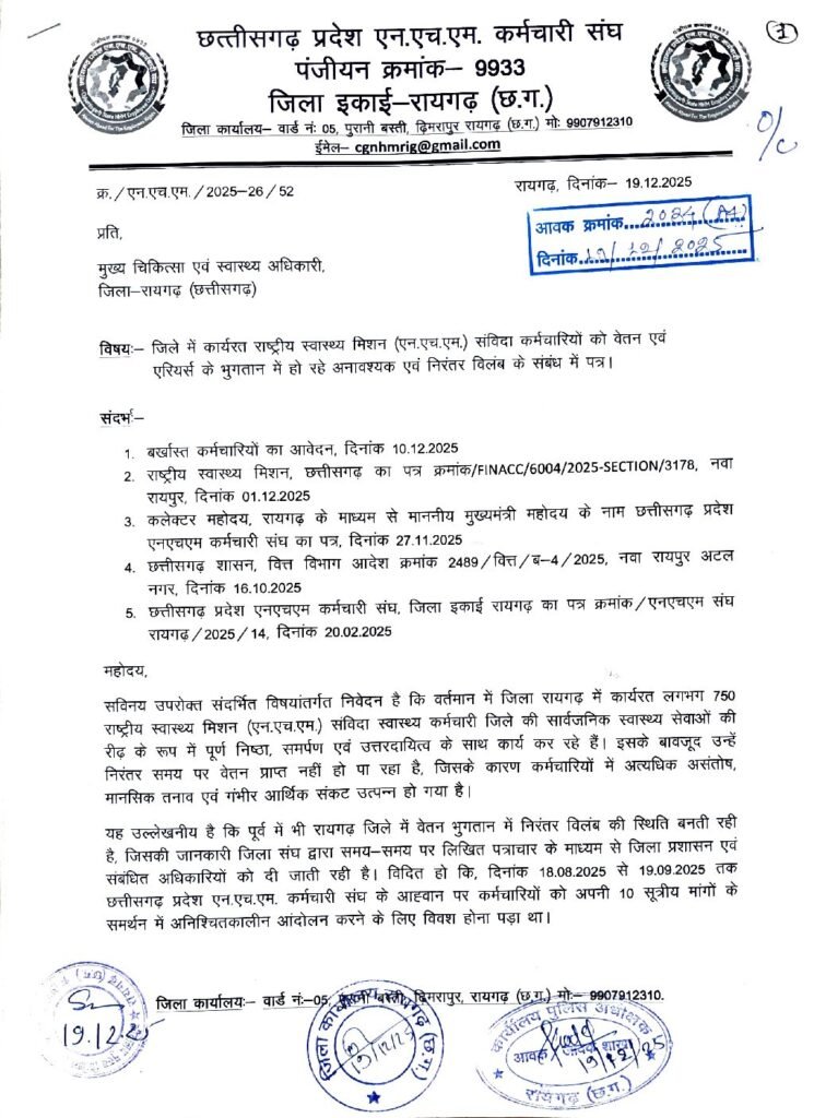 रायगढ़ जिले में लगभग 750 एनएचएम संविदा कर्मचारी, जिसमें 230 सीएचओ कार्यरत हैं, जो ग्रामीण एवं दूरस्थ क्षेत्रों में स्वास्थ्य सेवाओं की रीढ़ हैं। इसके बावजूद, उन्हें समय पर वेतन नहीं मिल रहा है। हाल ही में, 12 दिसंबर 2025 को अक्टूबर माह का वेतन प्रदान किया गया, जबकि नवंबर माह का वेतन एवं जुलाई 2023 से देय 5 प्रतिशत एरियर्स की राशि आज तक लंबित है।