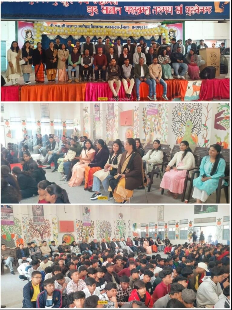 अमरकंटक – मां नर्मदा जी की उद्गम स्थली / पवित्र नगरी अमरकंटक में संचालित पी.एम. श्री जवाहर नवोदय विद्यालय अमरकंटक अनूपपुर मध्य प्रदेश में दिनांक 21 दिसंबर 2025 को प्राचार्य महोदय आशीष शुक्ला के कुशल नेतृत्व एवं मार्गदर्शन में भूतपूर्व छात्र-सम्मेलन का आयोजन किया गया जिसमें छात्र बड़े ही हर्षोल्लास व धूमधाम से मनाये l सर्वप्रथम विद्यालय प्रांगण के प्रवेश द्वार पर बाहर से आए समस्त भूतपूर्व छात्र-छात्राओं का प्राचार्य महोदय द्वारा पुष्पगुच्छ देकर एवं तिलक लगाकर स्वागत किया गया l प्राचार्य महोदय भूतपूर्व छात्र एवं छात्राओं तथा समस्त शिक्षकगणों के द्वारा विद्या की देवी माता सरस्वती की प्रतिमा पर माल्यार्पण एवं दीप प्रज्वलित कर कार्यक्रम पारंपरिक शुरुआत की गई ।