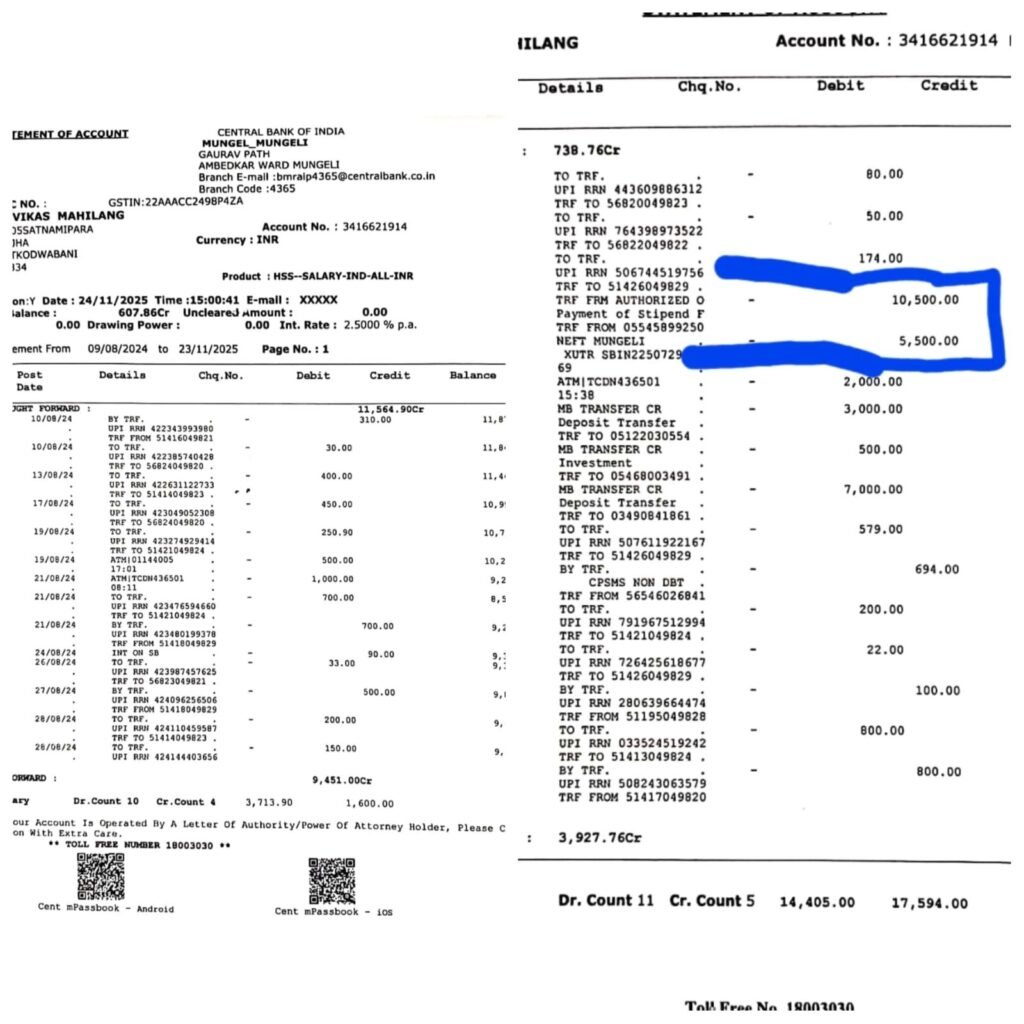 - सेन्ट्रल बैंक ऑफ इंडिया मुंगेली ब्रांच से जुड़ा एक और गंभीर मामला जल्द सामने लाया जाएगा, जिसमें सरकारी विभाग के पैसों को बैंक कर्मचारी द्वारा UPI के माध्यम से परिचितों के खातों में ट्रांसफर किए जाने के आरोप हैं।