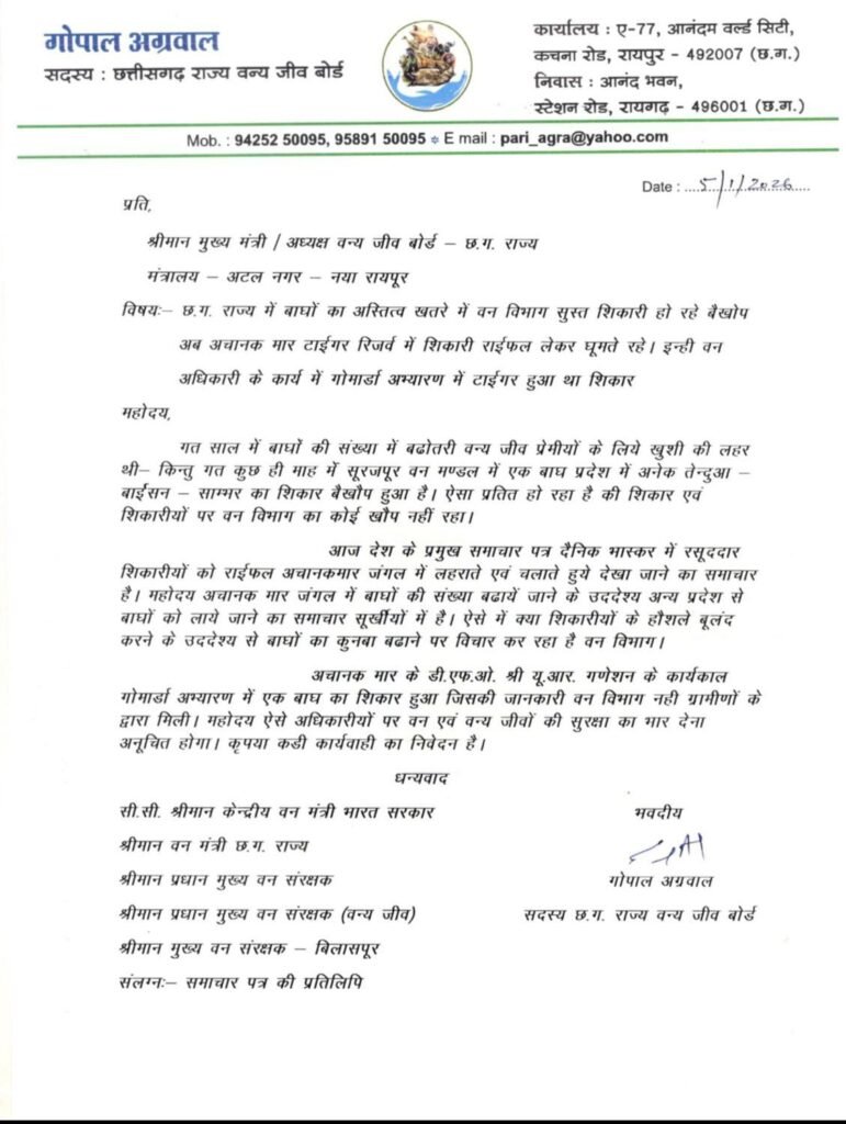 गोपाल अग्रवाल ने अपने पत्र में यह भी कहा है कि देश के प्रमुख समाचार पत्रों में यह समाचार प्रकाशित हुआ है कि राइफल लेकर शिकारी जंगलों में खुलेआम घूमते देखे गए। यह तथ्य बेहद चिंताजनक है और इससे यह आशंका और गहरी हो जाती है कि अचानकमार टाइगर रिजर्व में बाघों की संख्या बढ़ाने के नाम पर कहीं अन्य राज्यों से बाघ लाने या शिकार को नजरअंदाज करने जैसे प्रयोग तो नहीं किए जा रहे हैं। यदि ऐसा है तो यह न केवल वन्य जीव संरक्षण कानूनों का उल्लंघन है, बल्कि बाघों के अस्तित्व के लिए भी बड़ा खतरा है।