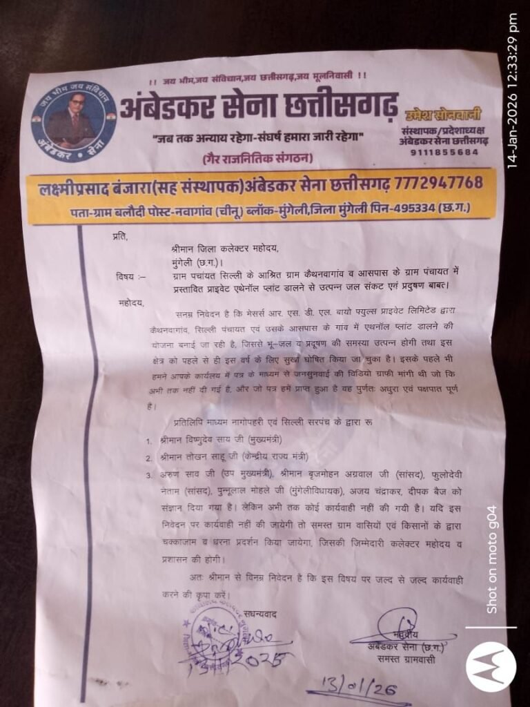 मुंगेली । ग्राम पंचायत सिल्ली के आश्रित ग्राम कैथनवागांव एवं आसपास के क्षेत्रों में प्रस्तावित प्राइवेट एथनॉल प्लांट को लेकर ग्रामीणों में भारी आक्रोश व्याप्त है। अंबेडकर सेना छत्तीसगढ़ के संस्थापक व प्रदेशाध्यक्ष उमेश सोनवानी के नेतृत्व में संगठन ने जिला कलेक्टर मुंगेली को ज्ञापन सौंपते हुए इस परियोजना से संभावित जल संकट और पर्यावरण प्रदूषण को लेकर कड़ी आपत्ति दर्ज कराई है।