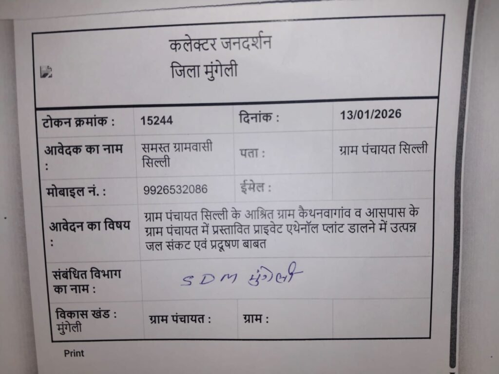 संगठन ने जिला कलेक्टर से मांग की है कि जनहित को सर्वोपरि रखते हुए प्रस्तावित एथनॉल प्लांट पर तत्काल रोक लगाई जाए, साथ ही निष्पक्ष और पारदर्शी जनसुनवाई आयोजित कर ग्रामीणों की आपत्तियों को सुना जाए। यह ज्ञापन जनदर्शन टोकन नंबर 15244 के अंतर्गत प्रस्तुत किया गया है।
