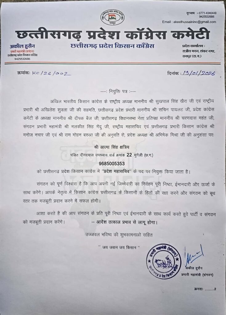 मुंगेली । छत्तीसगढ़ प्रदेश किसान कांग्रेस संगठन में बड़ा संगठनात्मक फेरबदल करते हुए पार्टी नेतृत्व ने आत्मा सिंह क्षत्रिय को प्रदेश महासचिव की महत्वपूर्ण जिम्मेदारी सौंपी है। यह नियुक्ति अखिल भारतीय किसान कांग्रेस के राष्ट्रीय अध्यक्ष सुखपाल सिंह खैरा सहित शीर्ष नेतृत्व की सहमति एवं प्रदेश कांग्रेस नेतृत्व की अनुशंसा पर की गई है।