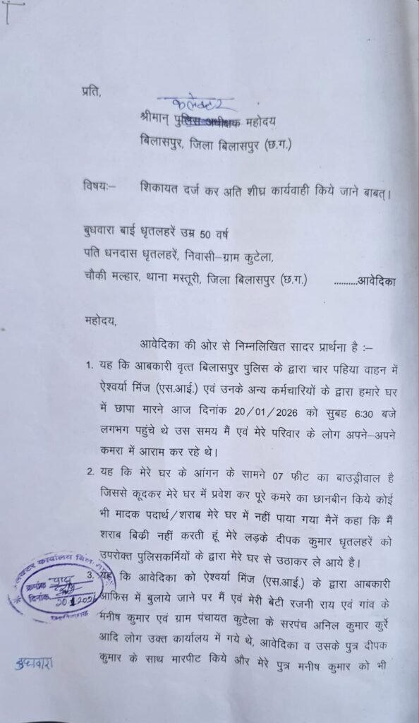 बिलासपुर । जिले के मस्तूरी थाना क्षेत्र के ग्राम कुटेला निवासी एक महिला ने आबकारी विभाग के अधिकारियों पर गंभीर आरोप लगाते हुए कलेक्टर और पुलिस अधीक्षक से लिखित शिकायत की है। पीड़िता बुधवारा बाई धृतलहरें उम्र 50 वर्ष ने आरोप लगाया है कि आबकारी विभाग की एसआई ऐश्वर्या मिंज और उनकी टीम द्वारा उनके घर में अवैध रूप से छापा मारकर न केवल परिवार के सदस्यों के साथ दुर्व्यवहार किया गया, बल्कि उनके एक बेटे को जबरन उठाकर ले जाया गया और झूठे मामले में फंसाने की धमकी दी जा रही है।पीड़िता के अनुसार, 20 जनवरी की सुबह लगभग 6:30 बजे आबकारी वृत्त बिलासपुर की टीम चार पहिया वाहन से उनके घर पहुंची। उस समय परिवार के सभी सदस्य अपने-अपने कमरों में आराम कर रहे थे। आरोप है कि पुलिसकर्मियों ने घर के सामने बने सात फीट ऊंचे बाउंड्रीवाल को फांदकर अंदर प्रवेश किया और बिना किसी वैध कारण के घर की तलाशी ली। तलाशी के दौरान घर में किसी प्रकार की शराब या मादक पदार्थ बरामद नहीं हुआ, फिर भी अधिकारियों ने पीड़िता के बेटे दीपक कुमार धृतलहरें को जबरन अपने साथ ले गए। शिकायत में बुधवारा बाई ने बताया कि बाद में उन्हें आबकारी कार्यालय बुलाया गया, जहां वे अपनी बेटी रजनी राय, छोटे बेटे मनीष कुमार और ग्राम पंचायत कुटेला के सरपंच अनिल कुमार के साथ पहुंचीं। वहां एसआई ऐश्वर्या मिंज और अन्य कर्मचारियों द्वारा उनके साथ और उनके बेटे दीपक तथा दूसरे बेटे मनीष के साथ मारपीट की गई। आरोप है कि दोनों बेटों को आबकारी कार्यालय परिसर में जबरन बैठाकर रखा गया और उन्हें मानसिक व शारीरिक रूप से प्रताड़ित किया गया। पीड़िता ने यह भी आरोप लगाया है कि एसआई ऐश्वर्या मिंज द्वारा मामले को रफा-दफा करने के लिए उनसे दो लाख रुपये की मांग की गई। जब पीड़िता ने पैसे देने से इनकार किया और कहा कि उन्होंने कोई अपराध नहीं किया है, तो उनके साथ मारपीट कर कार्यालय से भगा दिया गया। महिला का कहना है कि अधिकारियों द्वारा उन्हें लगातार धमकाया जा रहा है और उनके बेटों के खिलाफ झूठा मुकदमा दर्ज करने की तैयारी की जा रही है। बुधवारा बाई ने यह भी आरोप लगाया कि आबकारी विभाग के कुछ कर्मचारी क्षेत्र में अवैध शराब बिक्री को बढ़ावा देकर कमीशन वसूलते हैं, जबकि निर्दोष लोगों को परेशान किया जा रहा है। उन्होंने कहा कि उनके घर में एक बार छापेमारी की गई थी, उस वक्त पीने के लिए रखे शराब पर कार्रवाई करने की धमकी देकर डेढ़ लाख रुपए वसूले गए थे, उसी तरह इस बार भी छापेमारी की गई लेकिन कुछ नही मिला, जिसके बाद परिवार को डराने-धमकाने का प्रयास किया जा रहा है, जबकि उनके खिलाफ किसी भी प्रकार का ठोस सबूत नहीं है। पीड़ित परिवार ने कलेक्टर और पुलिस अधीक्षक से पूरे मामले की निष्पक्ष जांच कराने की मांग की है