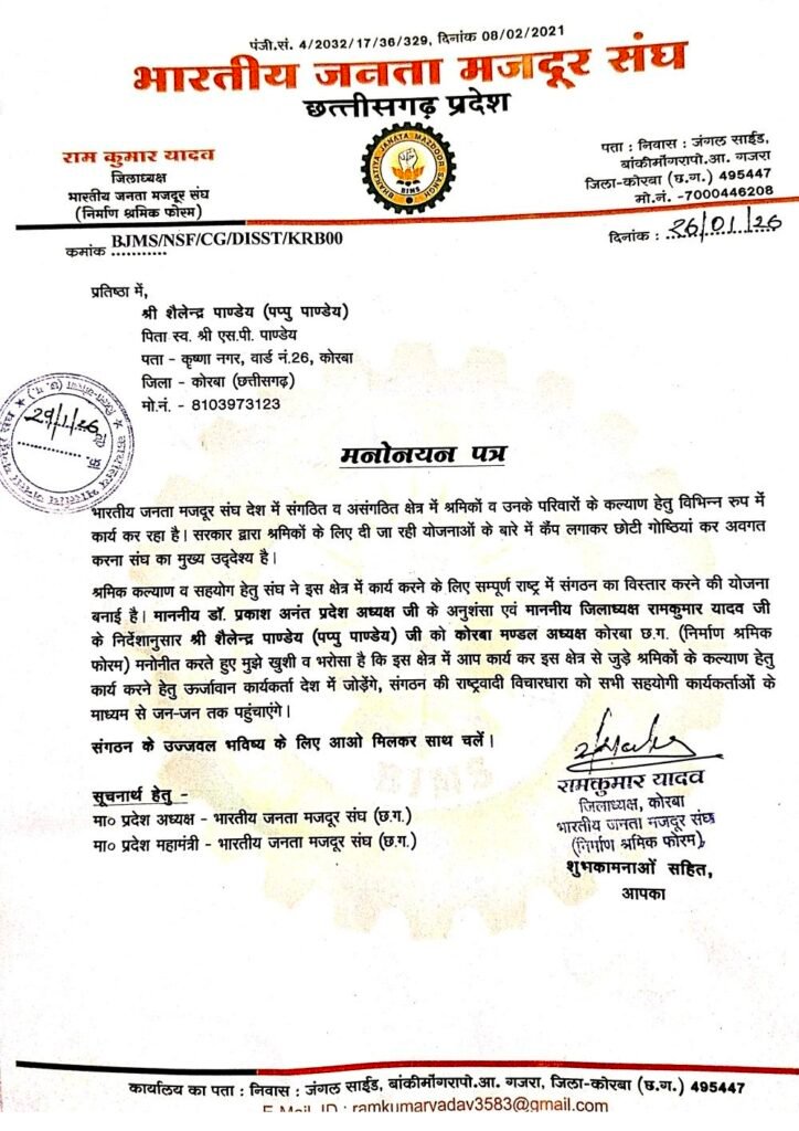 भारतीय जनता मजदूर संघ ने शैलेन्द्र पाण्डेय को कोरबा मंडल अध्यक्ष किया मनोनीत।