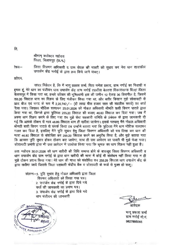 किसान भानु प्रकाश शर्मा ने बताया कि उन्होंने शासन के नियमों के तहत धान उपार्जन केंद्र नगाई में अपनी उपज का पंजीयन कराया था। कुल 12 एकड़ 36 डिसमिल भूमि के आधार पर 255.20 क्विंटल धान विक्रय हेतु पंजीकृत किया गया था। इसके बावजूद भौतिक सत्यापन में नोडल अधिकारी द्वारा भारी त्रुटि करते हुए धान की मात्रा को मात्र 46.80 क्विंटल दर्शा दिया गया।इस गलती को सुधारने के लिए किसान द्वारा समय रहते संबंधित अधिकारियों को आवेदन दिया गया। नोडल अधिकारी ने स्वयं त्रुटि स्वीकार करते हुए जिला विपणन अधिकारी को सुधार हेतु पत्र भी प्रेषित किया, जिसकी पावती भी किसान को दी गई। इसके बावजूद 30 जनवरी 2026 को धान खरीदी की अंतिम तिथि समाप्त हो जाने के बाद भी न तो त्रुटि सुधारी गई और न ही किसान को टोकन प्रदान किया गया। धान विक्रय न हो पाने के कारण किसान पर सहकारी समिति एवं बैंक का ₹2,20,742 का कर्ज बना हुआ है, जिससे उन्हें मानसिक, आर्थिक और सामाजिक परेशानी का सामना करना पड़ रहा है।