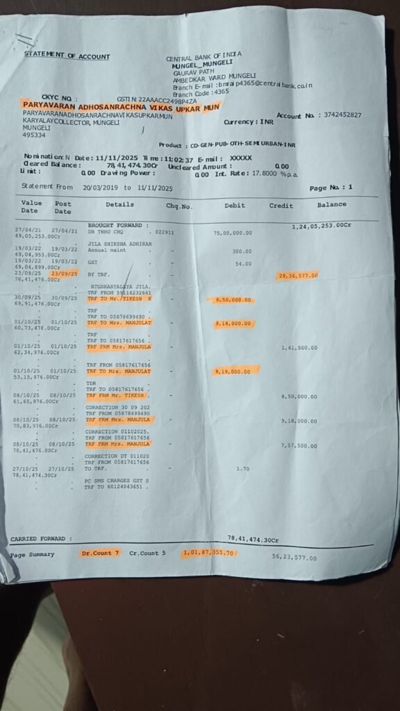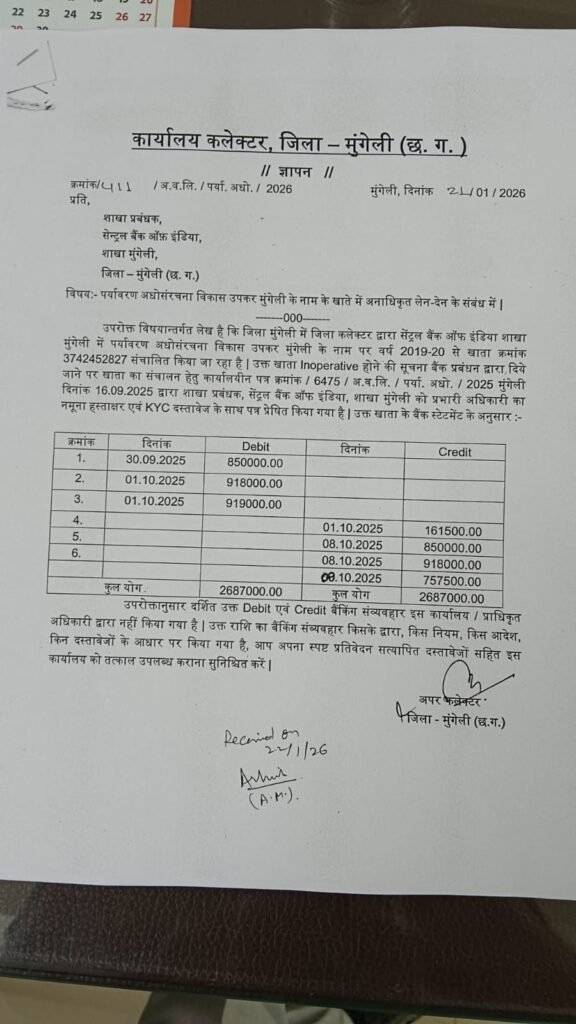 मुंगेली। जिले में शासकीय धन की सुरक्षा को लेकर गंभीर सवाल खड़े हो गए हैं। सेंट्रल बैंक ऑफ इंडिया की मुंगेली शाखा से जुड़े शासकीय राशि गबन के मामले ने बैंकिंग व्यवस्था की कार्यप्रणाली पर प्रश्नचिह्न लगा दिया है। कलेक्ट्रेट मुंगेली की अधोसंरचना मद में जमा 26 लाख 87 हजार रुपये को एक बैंक कर्मचारी द्वारा अनधिकृत रूप से ट्रांसफर किए जाने का मामला सामने आते ही प्रशासनिक हलकों में हड़कंप मच गया।