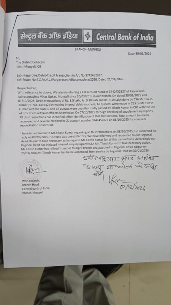 शासकीय धन में सेंध सेंट्रल बैंक मुंगेली में 26.87 लाख की हेराफेरी, बैंक प्रबंधन कटघरे में