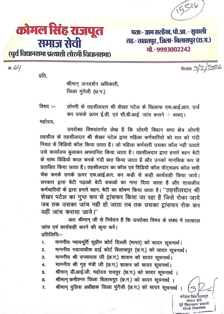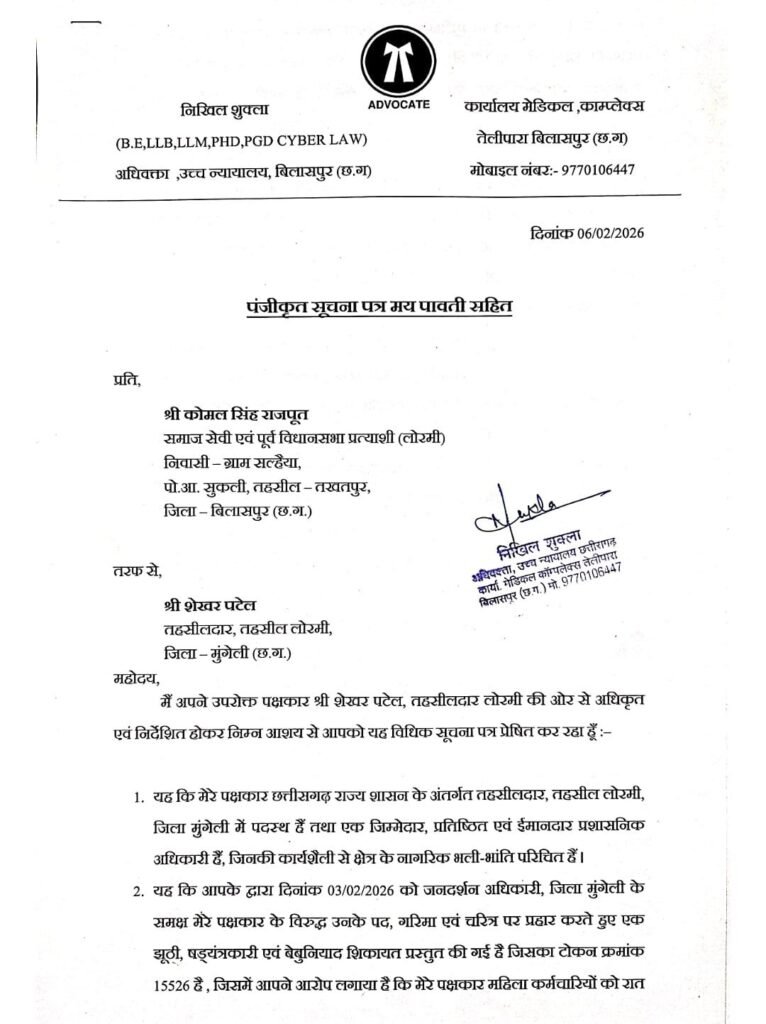 लोरमी। राजनीति के लिहाज से संवेदनशील मानी जाने वाली लोरमी विधानसभा में एक प्रशासनिक अधिकारी की छवि धूमिल करने का प्रयास अब आरोप लगाने वालों पर ही भारी पड़ता नजर आ रहा है। सोशल मीडिया के माध्यम से तहसीलदार शेखर पटेल के खिलाफ फैलाए गए कथित आरोपों को उन्होंने सिरे से खारिज करते हुए हाईकोर्ट में मानहानि का कानूनी नोटिस भेजा है।