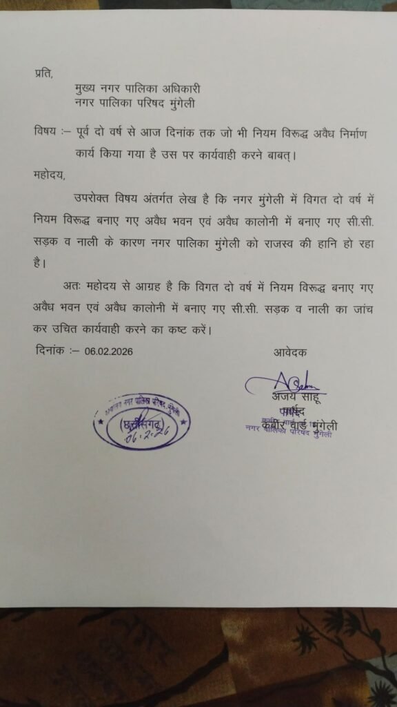 मुंगेली में अवैध निर्माण पर सख्ती की मांग दो वर्षों से नियम विरुद्ध भवन व कॉलोनियों से नगर पालिका को राजस्व नुकसान पार्षद अजय साहू ने सीएमओ को सौंपा ज्ञापन