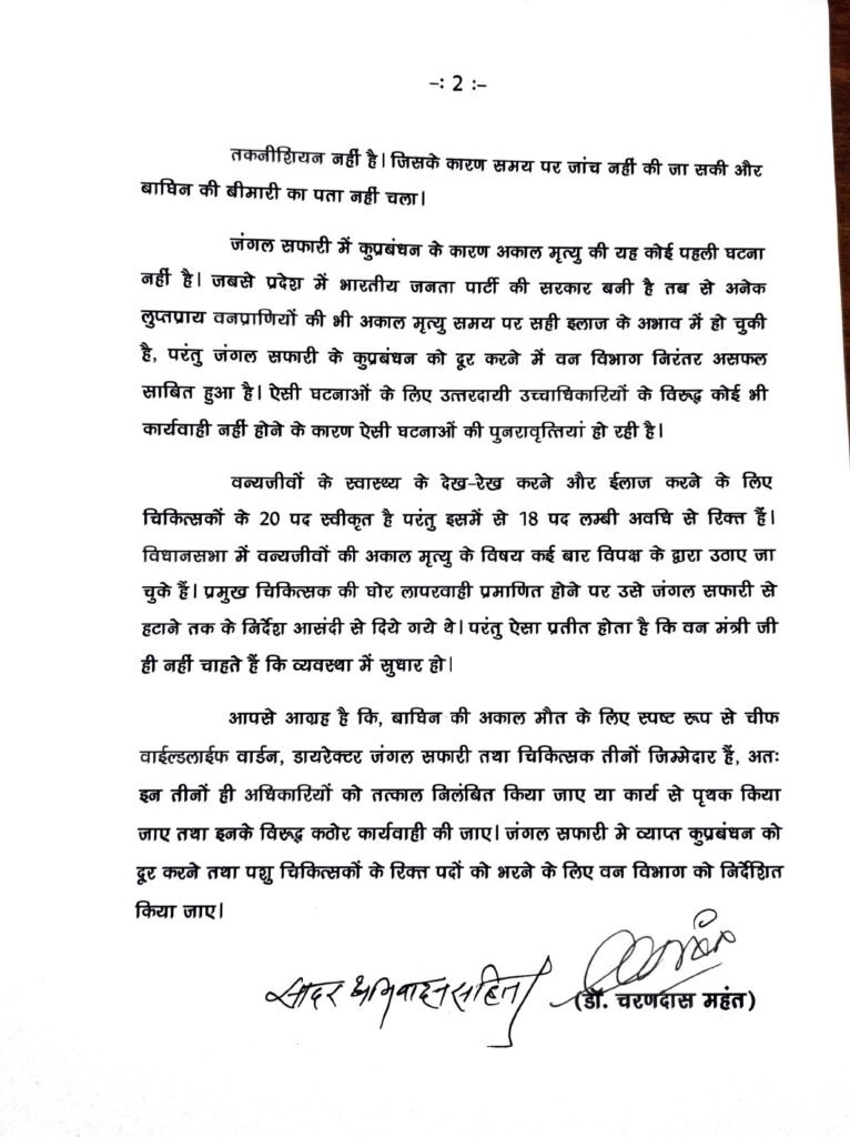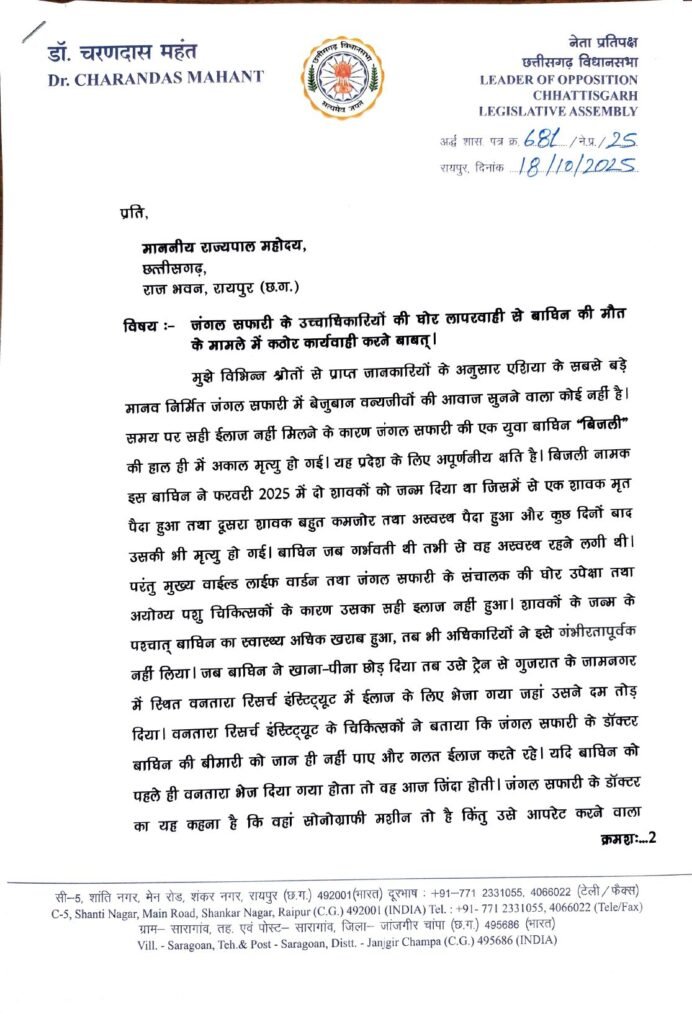 राज्यपाल को नेता प्रतिपक्ष डॉ. महंत ने लिखा पत्र। जंगल सफारी के उच्चाधिकारियों की घोर लापरवाही से बाघिन की मौत मामले में कठोर कार्यवाही हो – डॉ महंत